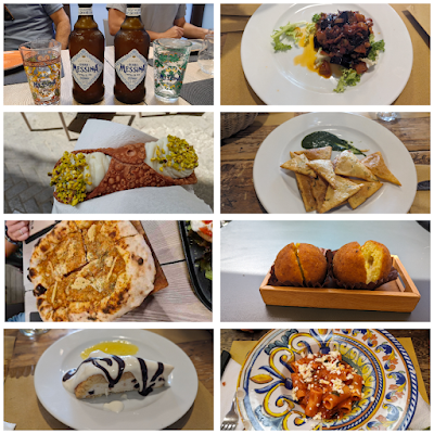 Comida siciliana: Birra Messina, caponata, cannolo, panelle, sfincione, arancini, cassata, pasta a la Norma